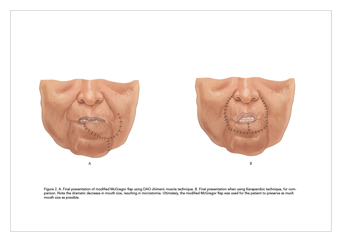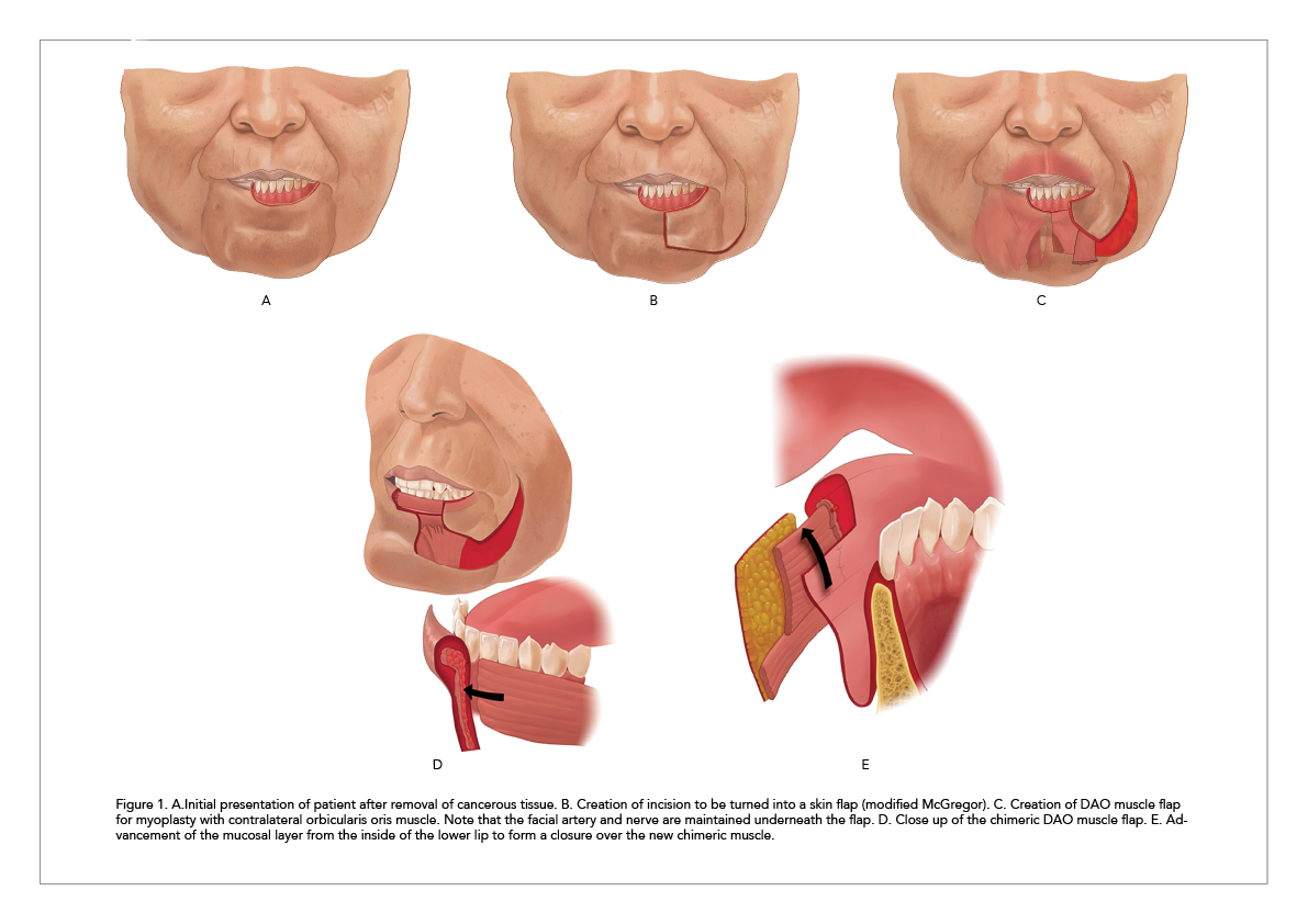 Surgical illustrations of a lower lip reconstruction surgery, specifically the McGregor flap with chimeric DAO myoplasty to reduce microstomia. Illustrations based on a surgery I observed in-person.